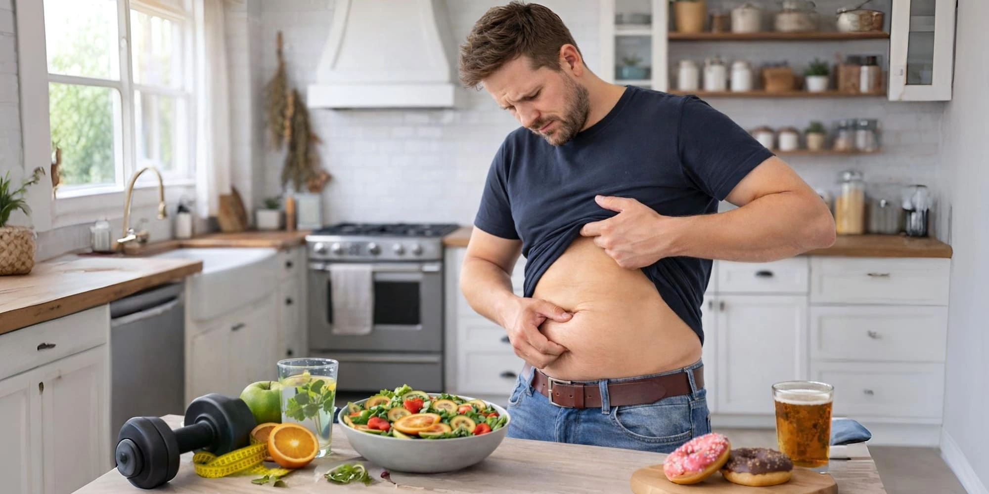 Часто с возрастом мужчины начинают меньше следить за своим рационом. Частое потребление калорийной пищи, фастфуда и алкоголя способствует накоплению жира в области живота.